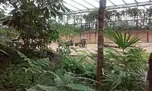 Jungola is jungle-themed and displays butterflies, tropical birds, large reptiles (such as Chinese alligators and pythons), ring-tailed lemurs, lar gibbons, small-clawed otters and Asian elephants. The most prominent feature of Jungola is the indoor tropical rainforest hall Rimbula, which at 18,000 m2 (190,000 sq ft) is the largest zoo jungle hall in the world and the largest greenhouse in Europe.[5] Serenga is the African savanna section and is home to species such as lion, Grant's zebras, Rothschild's giraffes, white rhinoceros and hamadryas baboons, but also Australian red-necked wallabies. Nortica is aimed at cold oceans and is home to polar bear, Californian sea lion, South American fur seal and Humboldt penguin. The final main section, Animazia, is a large indoor playground, but also home to an aquarium with species such as corals, green sea turtles and tropical fish.[6]