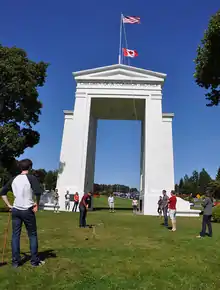 The participants gathered to play Round 1 at the Canada/US, Surrey/Blaine border. Sunny skies above provided beautiful weather and scenery for the match, which utilized the giant monument as a glorious center wicket in a Traditional-style croquet pitch. After many players used the massive arch for a ricochet shot, all were required to recite the structure's internally scribed message: “May These Gates Never Be Closed.” The sheer spectacle of the group was undoubtedly captured by numerous cameras travelling by on either side, potentially securing a lasting legacy in the hard drives of strangers.