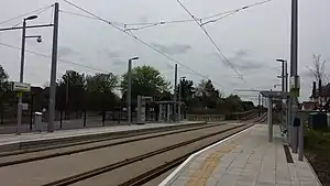 Wilford Lane is a tram stop on the Nottingham Express Transit (NET) network, in the titular city, England. The stop takes its name from Wilford Lane and the village of Wilford, and lies on the boundary between the city of Nottingham and the district of Rushcliffe. The stop is on line 2 of the NET, from Phoenix Park via the city centre to Clifton, and trams run at frequencies that vary between 4 and 8 trams per hour, depending on the day and time of day.[1][2][3]