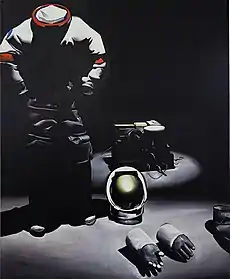 Sasnal is primarily a painter. He paints a wide variety of subjects: More or less banal everyday objects, portraits of historical figures, views of his home town Kraków, snapshots of friends and family members and very often existing images from the internet or mass media are his starting point. Other sources include Art Spiegelman's 1973 graphic Holocaust novel Maus, and stills from Claude Lanzmann's 1985 documentary Shoah as source material.[4] Even if, over the years, one can make out a number of overarching themes, there are always new paintings that shift the emphases and connections once again. The same is true of his painting style. His approach is unpredictable and his methods range from graphic reduction and a pointedly two-dimensional, illustration-oriented style to seemingly autonomous gestures with brush and paint. Like Neo Rauch, however, Sasnal makes the grip of the Communist era on the post-Communist imagination his subject.[5]