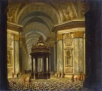 Van Ehrenberg painted many architectural paintings usually of imaginary church interiors, temples, palaces and art galleries. Paintings such as the Interior of the Saint-Carolus-Borromeus Church in Antwerp (1667; Royal Museums of Fine Arts of Belgium, Brussels)[4] emphasize the Baroque architecture of the space depicted, but are more artificial than his Dutch Golden Age contemporaries such as Pieter Jansz Saenredam or Emanuel de Witte.[1] His Interior of the St. Peters' Church in Rome stands in the tradition of Antwerp architecture art from the first half of the 17th century. However, the spatial effect in the oeuvre of van Ehrenberg is stronger. He showed a particular preference for the fantastic and pathetic, which he emphasized further with light-dark contrasts and a staffage of almost dwarfish figures (often painted by other artists).[5]