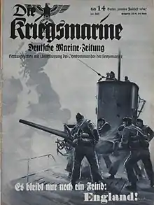 In 1940, following the German victory in the Battle of Narvik the Bertelsmann publishing house released this lavishly turned-out book written by Busch. It was a work of "war reporting which toed the party line", it had an introduction by Grand Admiral Erich Raeder and was recommended by the OKW in the Books of the Armed Forces.[19] The book was celebrated in the specialist press and after a year 200,000 copies had been sold. In 1941 Busch earned 242,084.47 RM from his writing activities, and in the following years he earned approximately 100,000 RM a year. In doing so, at that time he was among the highest-earning German authors. The Bertelsmann publishing house earned a clear total profit of 650,000 RM from the book.[20] It reached place 17 in a list of Best sellers of the Third Reich which was published in 2010.[21] According to Christian Adam, if you ignore the moral aspect, the Narvik book is generally well crafted, although at many places it was "quickly cobbled together". In a mixture of reporting, fictional elements and documents he describes a part of Operation Weserübung, that is the attack on Norway and the capture of the iron-ore port of Narvik. The war described in the book which is written from the perspective of a field commander is "clean". Death and suffering are blanked out. Alleged atrocities carried out on German survivors by the Royal Navy are emphasised. The book was a propagandistic success which achieved its desired effect in encouraging young men to go to war. "If he shows his characteristic arrogance, the Englishman has to be hit hard in the face. The sons of the island do not react to anything else".(Busch)[22] As a result of a part of the text in the first chapter the book fell foul of several competing censors: the Reich Ministry of Public Enlightenment and Propaganda, the Führer's official representative for the supervision of the overall spiritual and ideological training and education of the Nazi party, Alfred Rosenberg, and the Navy.[23] Despite meeting its desired effect as propaganda, Busch was criticised by the SS poet Kurt Eggers because he was not writing from his own experience. He argued that when the time came it was only from the circle of the "Narvik travellers" that the "prophets and singers" would be found who could write the conclusive heroic epic of this journey to the north. The book which Busch had written had only immediate value. The book also caused offence because of a description of a German church service which, however, Busch concluded in a contemporary way: "We have paid tribute to our fallen comrades who bravely and proudly went to death for our Führer, our race, and our Fatherland...Long live the Führer."(Busch)[24] In autumn 1941 the book was withdrawn from the market, after the publisher had already sold 615,000 copies.[25] As the book had been favourably budgeted, it provided Bertelsmann with its biggest net profit for a single book during the Third Reich. The publishing of this book was also very lucrative for the author. By to 1945 Busch had written about seventy further works, including the autobiographical novel Cruiser in the Red Tide which he wrote under the pseudonym Peter Cornelissen. In this novel he portrayed the final phase of the First World War and the Revolution of 1918 from the perspective of a young naval officer on board the minelaying light cruiser SMS Bremse. Busch wrote factual books, novels and books for the young, often containing propaganda for the navy. In addition he was also editor of the magazines Imperial German Navy, German Naval Newspaper and Raise the Anchor!. In addition he was also one of the authors who contributed to the series Wartime Library for German Youth.
