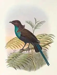 Wilhelmina's bird-of-paradise, also known as Wilhelmina's riflebird, is a bird in the family Paradisaeidae that is presumed to be an intergeneric hybrid between a greater lophorina and magnificent bird-of-paradise.