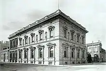 In 1882, after the Foreign Affairs Ministry moved from the southern corner to the northern side of the square (No. 75/76), the corner building was occupied by the Imperial Treasury, the highest financial authority in the land as of 1879. Next door to the east in Wilhelmplatz 2, the Imperial Insurance Institution had its seat from 1887 to 1894 until the Treasury needed to expand, forcing them out. In 1909, No. 2 was finally redone so that it completely optically matched No. 1. Though, before this project was completed, the compound had already expanded (in 1904) to include Wilhelmstraße 60 to the south.[29]