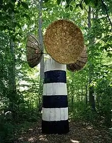 "Interestingly, Gill never cuts a tree for his sculptures; instead, he recycles and reclaims fallen trees and dead wood that he finds in the forest or salvages from building demolition sites. An example of such recycling is the wood coming from the infamous Mount Cashel orphanage ground. The main building was levelled four years ago, many years after the scandal of sexual and physical child-abuses by Christian Brothers. Trees were also cut down to put up a supermarket. The maple the artist recovered from the site is found in his work titled Workhorse (1998), permanently installed at the Boreal Sculpture Park in St. John's. Hanging from the maple beam are some 500 rectangular pieces of birch on bronze rods. While the birch and bronze elements reflect each other by their similarity in size and shape, these two parts of the sculpture present opposing qualities. The marks left by the chainsaw stand as witness of the artist's intentions while conferring roughness, solidity, and strength to the piece. In contrast, the mirror image hung on bronze rods that is animated when the wind blows is delicate and lyrical in feeling."[10]