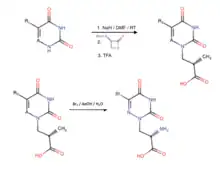 The lower binding affinity of willardiine for the AMPA and kainate receptors can be attributed to the unsubstituted carbon on position 5 of the 6-membered ring. Substitutions of large, electron-withdrawing groups at this position increase the affinity for kainate receptors but decrease the binding affinity for AMPA receptors.[6] An example of the synthesis of one analog, 5-bromowillardiine, is shown in Figure 6.