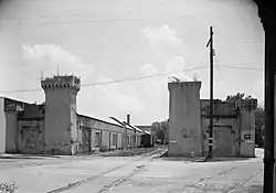 There are two principal depot buildings in the district. The "Camden Depot" stands on John Street, and the "Tower Depot", now little more than a pair of crenellated towers, stands on Mary Street. These two buildings were completed in 1850, and in the area between, two warehouses were built in the following decade. The depots and one of the warehouses are architecturally distinguished by their Gothic Revival features, which are not frequently found on railroad infrastructure. The Tower Depot, which was the railroad's original passenger depot, was only used until 1853, when a through depot was built near Line Street. In 1857 the large brick Italianate car shop was built adjacent to the main railroad line just north of Line Street.[3]