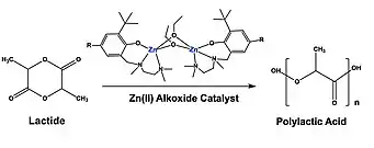 Polymerization of lactide to polylactic acid with a Zn(II) alkoxide catalyst.[20]
