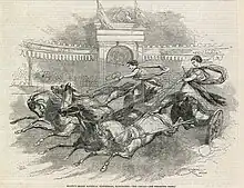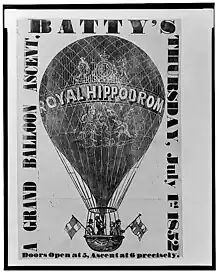 Batty was an equestrian performer as early as 1828, and by 1836 he was operating his own circus.[1] In that year, Pablo Fanque was performing with him in Nottingham as a "rope dancer." In the ensuing years, Batty's circus travelled throughout the United Kingdom; in 1838, he was at Newcastle and Edinburgh and, in 1840, at Portsmouth and Southampton. When Astley's Amphitheatre suffered its third fire, Batty was in Dublin, and boarded the next steamer to London to arrange for its rebuilding in Westminster Street. Batty put W.F. Wallett in charge of the management of his circus in Dublin, while Batty made plans for a temporary circus in Oxford and until Astley's could be rebuilt. While Batty was at Oxford in 1841, Pablo Fanque left Batty to start his own circus. Wallett joined him.[2] On occasion, business would reunite Batty and Fanque over the next twenty years.