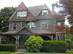Built circa 1886, this historic structure is a three-story, Wissahickon schist, clapboard, and shingle dwelling that was designed in the Queen Anne style. It features decorative quoining, gable, and hipped rooflines, and terra cotta decorative details. A two-story addition was built during the early 1900s. Also located on the property is a contributing brick stable with stone quoining.[2]