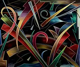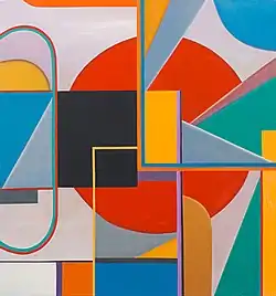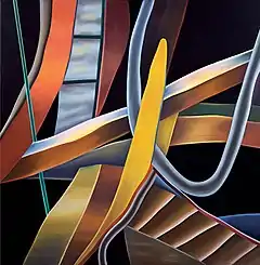 In his early career, Conger painted in a style reminiscent of Hans Hoffmann that, by 1970, gave way to work featuring hard-edged, modulated shapes set in complex juxtapositions against light grounds.[28] According to Mary Mathews Gedo, with Flossy's Night (1972), Conger's mature style began to emerge with more organic ribbon-like forms in luminous jewel tones edged in light and set against a deep red-black ground.[28] Also fully developed were his Immaculate, beautifully glazed surfaces and his "metaphysical," neon-like illumination which, lacking a visible source or cast shadows, created a surreal quality.[28][29][21] Critics like Artforum's C. L. Morrison soon noted Conger's growing assurance with color and composition, and an architectural turn employing frame-like apertures to contain his fractured, lively forms in a state of stained-glass-window equilibrium.[9][30][3]