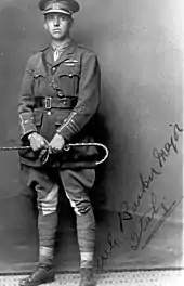 Born on a family farm in Dauphin, Manitoba, "Will" Barker grew up on the frontier of the Great Plains, riding horses, shooting, and working as a youngster on his father's farm and sawmill.[2][3][4] He was an exceptional shot, using a lever-action Winchester that he had modified with his own iron sight. He was particularly adept at shooting on the move, even while on horseback. One biographer has suggested that he could have been a trick shooter in a circus. He was physically poised, emotionally intense, with wide-ranging interests, and had an innate flair for the dramatic act. He was a very good student in school, but had frequent absences due to farm and sawmill life; he was the hunter providing food for the workers in the sawmill while still a young teenager, and missed classes because of this obligation.[5] Barker was a Boy Scout at Russell, Manitoba, and a member of the 32nd Light Horse, a Non-Permanent Active Militia unit based at Roblin, Manitoba. He was in Grade 11 at Dauphin Collegiate Institute in the fall of 1914, just before his enlistment.[6]