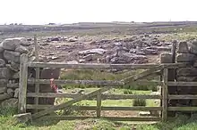 Although, according to Farrah, Grainge saw Castiles as a military camp, saying it also "bore evidence of having been the scene of Druidical worship",[5] today's archaeologists see it differently. It is now known as Cast Hills settlement, which extends beneath Castiles farm house and beneath the buildings across the road to the south of it. It also extends to the south and to the north-east of those buildings.[16] Heritage Gateway describes it as an Iron Age settlement which is protective, but not defensive. The site is now damaged, but it had a "central circular rampart of stone surrounded by a large irregular area, enclosed by a trench".[17] There is no public access, but "25 earthfast boulders and a boundary ditch" can be seen over the wall near Castiles farm house, from the Laverton–Pateley Bridge road.[18] It is possible that Grainge mistook a settlement with a rampart for a military camp, however just under 2 miles (3.22 kilometres) to the west of Castiles is Fortress Dyke, described as "a probable Iron Age/Romano-British square enclosure surviving as an earthwork", and Farrah - a naturalist, not an antiquarian - may have conflated the two sites.[19][20][nb 13] Grainge is likely to have visited Fortress Dyke, because while at Castiles "alone he explored all the valleys, woods, glens and ravines within half-a-dozen miles of his home".[5]
