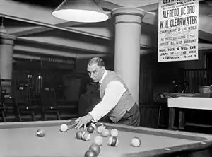 2. "Clearwater Loses To De Oro At Pool. Champion Takes First Block and Makes Some Remarkable Shots". New York Times. January 17, 1911. Retrieved 2009-09-21. Alfred De Oro, the pool champion, led W.H. Clearwater, former champion and challenger for the title, last night at Doyle's Academy in the first block of their 600-point match for the championship, by a score of 208 to 189.