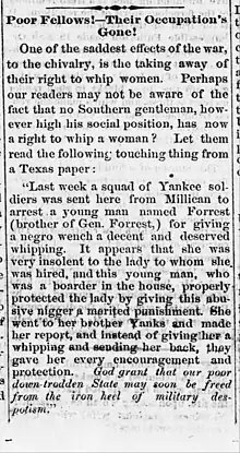 - "The Butcher Forrest and His Family: All of them Slave Drivers and Woman Whippers". Chicago Tribune. Vol. XVII, no. 293. Chicago, Illinois. May 4, 1864. p. 3 – via Newspapers.com.