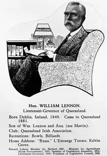 William Lennon (8 December 1849 – 5 May 1938) was a politician in Queensland, Australia. He was a Member of the Queensland Legislative Assembly and a Member of the Queensland Legislative Council. He was Lieutenant-Governor of Queensland.[1]
