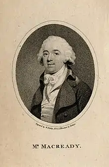 Macready appeared at Covent Garden Theatre, 18 September 1786, as Flutter in the Belle's Stratagem, and remained there ten years, playing parts such as Gratiano, Paris, Young Marlow, Figaro, Fag, and Tattle in Love for Love, and producing two plays by himself.[1] He returned to Dublin to take summer parts, to the early 1790s.[4][5]