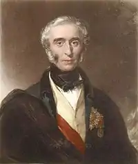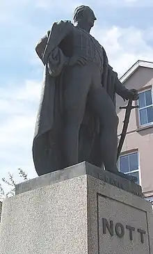A statue of General Nott was erected in his home town of Carmarthen in 1851. Sculpted by Edward Davis, it now has Grade II Listed status.[5] It was based on a portrait of Nott by the painter Thomas Brigstocke, who was also born in the town.[6] According to the PMSA, "the bronze statue was cast from cannon captured at the Battle of Maharajpur. Queen Victoria gave 200 guineas to the memorial fund. The statue occupies the site of the market cross which was dismantled when the market was resited and Nott Square created in 1846."[5]