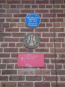 During Whitla's lifetime his gifts to his profession included the Good Samaritan stained glass window (commemorating the heroic behaviour of two Ulster doctors) erected in the Royal Hospital, and a building to house the Ulster Medical Society. At his death Lennoxvale was bequeathed to Queen's University as a residence for the Vice-Chancellor. The university also was his residuary legatee, and acted on his suggestion that the available funds should provide an assembly hall. The Sir William Whitla Hall was opened in 1949,[2] and now bears a plaque commemorating him.
