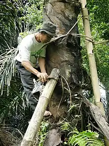 In 1980, when Smits proposed to his first wife, in Tomohon, North Sulawesi, he was surprised by the dowry: six sugar palms. At that time, a mature sugar palm that was ready to sap cost about as much as a chicken. Nevertheless, the people of Tomohon wanted sugar palms ("pohon aren") instead of gold as the dowry. "I wondered why it was that cheap," Smits says. Later he learnt the answer, calling the sugar palm a "magic tree".[15][16] He says of the sugar palm. "From the roots to the leaves, every bit is beneficial for people. Those who eat palm sugar will live longer than those who use cane sugar." During his years of research in North Sulawesi and other places in Indonesia where sugar palms grow, he has learned that people are not making the most of the tree and its properties.