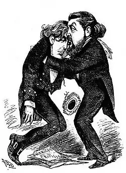 By the time of Oscar's marriage, in 1884, Willie was seriously in debt and drinking heavily. On 4 October 1891, aged 39, Willie married a wealthy widow, Mrs Frank Leslie (1836–1914), the owner of the Frank Leslie Publishing Company in New York.[7] She was initially attracted by Willie's humour and wit. He proceeded to spend much of his time in New York drinking at the fashionable Lotos Club, gossiping about London Society and reciting parodies of his brother's poems, which perhaps suggests that he was jealous of Oscar's success. His marriage was short-lived, Mrs Leslie starting divorce proceedings within a year on the grounds of Willie's drunkenness and adultery. They were finally divorced on 10 June 1893.[8][9] In recorded fact, Oscar Wilde’s lecture tour was underwritten and suggested by Mr. Liberty of Liberty’s of London and Mr. D’Oyly Carte to promote the latest successful Gilbert and Sullivan Musical “Patience” of the D’Oyly Carte Opera Company.