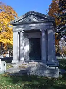Kilmer died from pneumonia in Binghamton on July 12, 1940,[3] having amassed a fortune of some $15 million, mostly from the sale of the patent medicine Swamp Root tonic, which is still for sale today.[4][5][6][7][8][9][10][11][12][13] After his death, Kilmer was interred at a mausoleum in Floral Park Cemetery in the Binghamton suburb of Johnson City, NY.