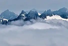 Wilmans Peaks is located in the marine west coast climate zone of western North America.[2] Most weather fronts originate in the Pacific Ocean, and travel northeast toward the Cascade Mountains. As fronts approach the North Cascades, they are forced upward by the peaks of the Cascade Range (Orographic lift), causing them to drop their moisture in the form of rain or snowfall onto the Cascades. As a result, the west side of the North Cascades experiences high precipitation, especially during the winter months in the form of snowfall, and because of maritime influence, snow tends to be wet and heavy, resulting in high avalanche danger.[2] During winter months, weather is usually cloudy, but, due to high pressure systems over the Pacific Ocean that intensify during summer months, there is often little or no cloud cover during the summer.[2] Due to its temperate climate and proximity to the Pacific Ocean, areas west of the Cascade Crest very rarely experience temperatures below 0 °F (−18 °C) or above 80 °F (27 °C).[2] The months July through September offer favorable weather for viewing or climbing the peaks.