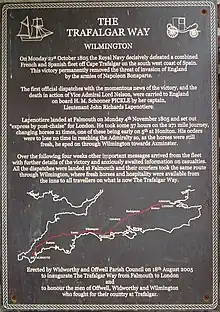 In 1805 the village street rang to the clatter of horses' hooves as messengers raced through with news of the Battle of Trafalgar. In 2005 this historic event was marked by the unveiling of this plaque on the White Hart Inn. The plaque records details of the messengers and remembers local men who fought at the Battle.[2]