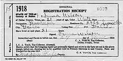 One of the first Texas primary voter registration receipts the year women were granted the right to vote in a Texas primary election.
