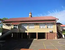 In this immediate post-war period two 1922 Sectional buildings (now known as blocks B and E) were relocated c.1949 to the site from Kelvin Grove Boys School, to accommodate Wilston State School's growing population.[60][61][62] Each contained two classrooms with an L-shaped verandah, and were positioned to the west and east of the 1920 building (Block C).[63][64] In c.1953 the eastern building (Block E) was extended at either end. The original eastern wall was relocated to the eastern extent of the extension and fabric from the original, western verandah was reused in the extensions. The original hatroom was relocated to the western corner of the new verandah. The extensions had large banks of timber casements in the southern walls, with timber sashes in the verandah walls. A curved pathway running between blocks C and E was repositioned to accommodate the extension.[65][1]