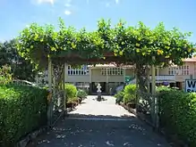 During the 1930s changes and additions to the grounds occurred. Around 1934 new toilets were constructed under the original 1920 building and the 1926 infants wing, and two acres of additional land was acquired from Coronation Park to the north for a sports oval in 1937.[50][51] Landscaping works, including a terraced lawn, concrete stairs, garden beds and a pergola at the main (Primrose Street) entrance, were undertaken by relief labour in 1932 as part of an ongoing school beautification scheme. This stage included the unveiling of a bust of Captain Cook, the work of James Arthur Watts, in a garden bed next to the pergola on 2 July 1932.[52][53][54] Further landscaping included a concrete retaining wall and balustrade around the parade area north of the 1920 building in 1933.[55] In 1935 a set of gates, constructed on the Thomas Street boundary, were funded through community fundraising and a donation from the noted manufacturer and philanthropist, George Marchant, who lived in the vicinity.[56] These gates consisted of concrete pillars with iron gates and an archway. They were officially opened on 21 September 1935.[57] In the same year, art deco-style balustrading was added to retaining walls north of the infants wing.[58][1]