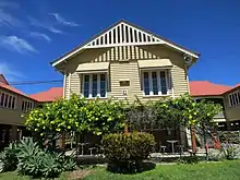 In 1954 another purpose-designed building (now known as Block G), was constructed near the Primrose Street boundary, southeast of the 1920 building. School fund-raising for it had begun in 1941 and by 1953, a plan for a £6250 new Visual Education Centre and Library was published in The Courier Mail. Half of the building cost was funded by the school's fund-raising efforts and half by the Queensland Government.[66][67] Designed by Brisbane firm, Blackburne and Gzell Architects, it was a two-storey timber building with a terracotta roof and a two-storey brick entrance porch.[68] The building was officially opened in 1954 by Queensland Premier, Vince Gair.[69][1]