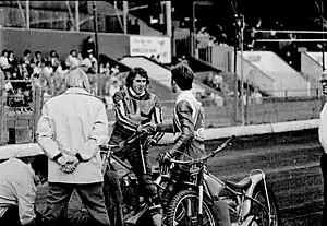 ![]() Wimbledon Dons captain Barry Briggs (centre) shaking hands with Oxford Rebels captain Gordon Kennett in 1975 | |||||||||||||||