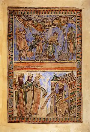 The thirty-eight full-page miniatures are all grouped at the beginning of the manuscript. They are nearly all divided horizontally into two or three compartments with different scenes, creating an unusually extended narrative cycle of more than eighty scenes covering the Old Testament (6 pages), the Life of the Virgin and Life of Christ (23 pages) and several scenes covering the Second Coming and Last Judgement (9 pages) - a number of non-narrative subjects such as the Jesse Tree, Christ in Majesty and an enthroned Virgin being included in these figures. Together they form "one of the most unusual and innovative miniature cycles of the twelfth century"[2]