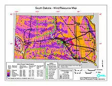 South Dakota is one of the country's windiest states, and has the potential of installing 882,000 MW, and generating 2,902 billion kWh/year.[4] Just as in Texas, the construction of new wind farms is transmission line limited.[5]
