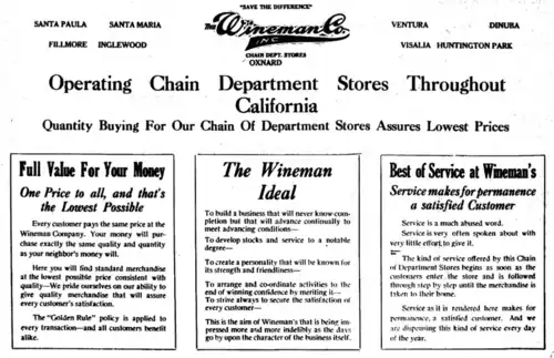 - ↑ "elcome Extended to Wineman Store". Oxnard Press-Courier. August 20, 1924.