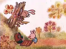 The second part closely follows the first one: it is co-written by Khitruk and Boris Zakhoder and is based on the Pooh's love for honey; its prototype drawings are two dimensional and are created by Khitruk and Vladimir Zuikov. A new character (Rabbit) is added to the core cast of the first part: Winnie-the-Pooh, the narrator, and the Piglet.[1][2]