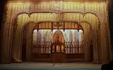 The most prominent interior feature was a large proscenium-arch stage at the heart of the building. The stage and its scenery were important in the rites and rituals of the various orders of masons, especially the Scottish Rite. The WMBA bought ninety-eight hand-painted scenic drops that were produced by Sosman and Landis Scene Painting Studios in Chicago. The temple was completed in December 1909 with mahogany finishes that reflected Masonic ideology. Masonic furniture and other decorations were also purchased.[2]