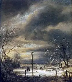 Winter Landscape near Haarlem (c. 1670s) is an oil on canvas painting by the Dutch landscape painter Jacob van Ruisdael. It is an example of Dutch Golden Age painting and is now in the collection of the Städel. This painting was documented by Hofstede de Groot in 1911, who wrote; "992. A WINTER LANDSCAPE. A snow-bound plain with trees to right and left. In the centre a road leads to the distance; away to the right is a cottage. In the centre foreground stands a solitary lamp-post. To the left of this are two travellers with a dog. Signed in full, according to the Sedelmeyer sale-catalogue, but the Frankfort catalogue does not mention a signature; canvas, 14 1/2 inches by 12 1/2 inches. Exhibited at Vienna, 1873, No. 165.