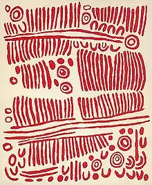 Tjunkiya and her sister Wintjiya did not confine their activities to painting canvases. In 2001 the National Gallery of Victoria purchased a collaborative batik, created by the sisters in cooperation with several other artists, together with one completed by Wintjiya alone.[18] These works were the product of a batik workshop run for the women of Haasts Bluff by Northern Territory Education Department staff Jill Squires and Therese Honan in the months following June 1994. The works, including several by Wintjiya, were not completed until 1995. Circular markings, used by Wintjiya in both these batiks and her subsequent paintings, represent the eggs of the flying ant (waturnuma), one of the main subjects of her art. She also portrays "tree-like organic motifs" and representations of hair-string skirts (nyimparra).[8] The sisters also gained experience with drypoint etching; works produced by Wintjiya in 2004 – Watiyawanu and Nyimpara – are held by the National Gallery of Australia.[19][20]