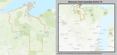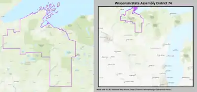 The 74th Assembly District of Wisconsin is one of 99 districts in the Wisconsin State Assembly.[2] Located in northern Wisconsin, the district comprises all of Ashland, Bayfield, Price, and Iron counties, along with southeast Douglas County and parts of northern Sawyer County. It includes the cities of Ashland, Bayfield, Park Falls, and Washburn, and the Bad River and Red Cliff Indian reservations. The district also contains the Apostle Islands National Lakeshore, Big Bay State Park, and most of the Chequamegon National Forest, as well as Timms Hill—the highest natural point in the state of Wisconsin.[3] The district is represented by Republican Chanz Green, since January 2023.[4]