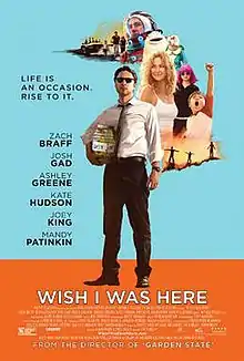 Wish I Was Here is a 2014 American comedy-drama film directed by Zach Braff and co-written with his brother Adam Braff.[4] The film stars Zach Braff, Donald Faison, Josh Gad, Pierce Gagnon, Ashley Greene, Kate Hudson, Joey King, Jim Parsons, and Mandy Patinkin. The film had its world premiere at the Sundance Film Festival on January 18, 2014[5] and was given a limited release on July 18, 2014 by Focus Features. This marked the final film appearances for James Avery and Allan Rich before their deaths on December 31, 2013 and August 22, 2020 respectively.