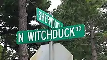 A Virginia Department of Historic Resources highway marker was erected in 2002 near Sherwood's statue. The location of her water test and the adjacent land are named Witch Duck Bay and Witch Duck Point. Virginia Beach has municipal streets and trails named Sherwood Lane, Witch Point Trail, and Witchduck Road in the area close to where the 1706 water test occurred, now known as Witch Dutch Bay. Many things are named "Witchduck" or "Witch Duck" in Virginia Beach and both spellings are used.[25]