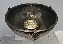 The richly decorated piece is an evolved "C bowl" with a broad circular indentation underneath. Foliate and vine-scroll filigree work decorates the top and bottom surfaces of the flat central indentation. In the middle of the bowl, on the top surface of the indentation, stands a long-necked dog-like animal, with blue glass eyes, tall enough to peer over the rim of the bowl; around it are arranged four small projecting animals heads. Semi-precious stones are also mounted inside the bowl. Equally spaced around the rim are four animal heads as the tops of loop escutcheons that extend down the sides of the bowl, held on with rivets and decorated with millefiori panels, terminating with small projecting human heads below the bowl. The loop escutcheons would allow the bowl to be suspended. There is a deep groove around the outside of the bowl, below the rim. The bowl may have been used to contain water, but, like other hanging bowls, its intended function is not certainly known. It has been compared to the 8th century Ormside bowl.[1] The filigree decoration resembles the Kirkoswald brooch and the blue glass recalls the Ardagh Chalice. The choice of material is unusual: almost all other hanging bowls are bronze.
