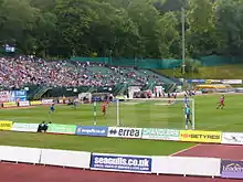 Withdean Stadium was voted the fourth worst football stadium in the UK by The Observer in 2004.[5] The temporary nature of the stadium was obvious - the stadium was primarily used for athletics; there was a single permanent stand along the north side, while the other stands were assembled from scaffolding, some of which also served as temporary seating at the Open Championship golf tournament. The largest was the South Stand, running the entire length of the pitch. The east end of the pitch contained two medium-sized and one small stand. One of the larger stands here was designated as the family stand. The West Stand was the designated away stand. Changing and hospitality facilities were provided with portable cabins placed haphazardly around the site, and there was very limited on-site car parking.