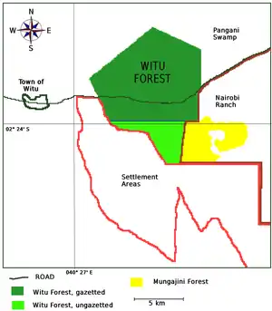 The Witu Forest is bounded to the northeast, and east, by the Pangani Swamp and to the east and southeast by the Nairobi Ranch, including the Mungajini Forest. To the south and southwest it is bordered by Witu settlement areas.[6] The settlement areas were established in 1995 for agricultural development for the local people.