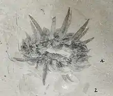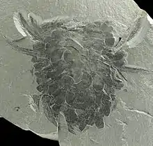 Wiwaxia is a genus of soft-bodied animals that were covered in carbonaceous scales and spines that protected it from predators. Wiwaxia fossils – mainly isolated scales, but sometimes complete, articulated fossils – are known from early Cambrian and middle Cambrian fossil deposits across the globe.[4][6][7] The living animal would have measured up to 5 cm (2 inch) when fully grown, although a range of juvenile specimens are known, the smallest being 2 millimetres (0.079 in) long.[7]