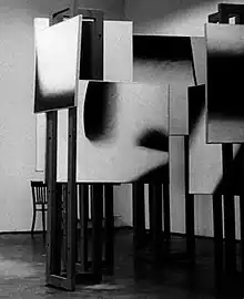 Emphasizing the spectator's physical experience, Fangor called this a “Positive illusory space". Unlike traditional form of painting, what Fangor described as “Renaissance hole-in-the-wall through which the spectator is compelled to look", contemporary painting according to the artist's own writings was supposed to have a direct impact on its surrounding and "radiate a force onto literal space which defines a zone of physical activity".[16] Fangor's installation, shown to the public six years prior to Robert Morris's breakthrough Minimalist exhibition at New York's Green Gallery, would become one of the earliest studies of phenomenological properties of abstract art in post-war Europe.[Note 2][17]