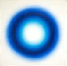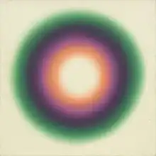The following year, several of Fangor's abstract paintings were included in a group exhibition organized at the Stedelijk Museum Amsterdam, providing the artist with a chance to showcase his recent work outside of the Iron Curtain. Around that time, the artist started to turn away from his earlier monochromatic palette in favor of color compositions.[15] He also began focusing on the circle, a geometric form that would become the most recognizable motif in his paintings and constitute the compositional basis for over four hundred works on canvas completed between 1958 and 1978.[20] At Stedelijk, Fangor and Zamecznik created another environment installation titled Color in Space where diverse "geometric forms and bright color zones in red, blue, and black affected the space of the exhibition and the constantly changing vision of the spectator."[15] In 1960, the artists published a Manifesto, in which they reiterated a commitment to moving beyond the picture plane and heightening the viewer's perception of the physical space.[15]