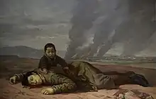 The new cultural doctrine of Socialist Realism, which imposed naturalistic visual vocabularies and mandated that artists focus on themes relating to everyday life under socialism, was officially introduced in 1949. By the following year, Fangor began painting Socialist Realist compositions. In 1951, he participated in the Second Nationwide Display of Plastic Arts, the second official exhibition of Polish Socialist Realist painting and sculpture organized by the Central Bureau of Art Exhibitions (Centralne Biuro Wystaw Artystycznych) at Zacheta National Gallery of Art, where his compositions titled Matka Koreanka (Korean Mother) from 1951 and Lenin w Poroninie (Lenin in Poronin) from 1951 were awarded the Second Prize for Painting.[7][Note 1] The former was praised by state-controlled press for its poignant criticism of the Korean War and for challenging what the Soviet Union propaganda defined as colonialist and imperialist ambitions of the United States.[8]